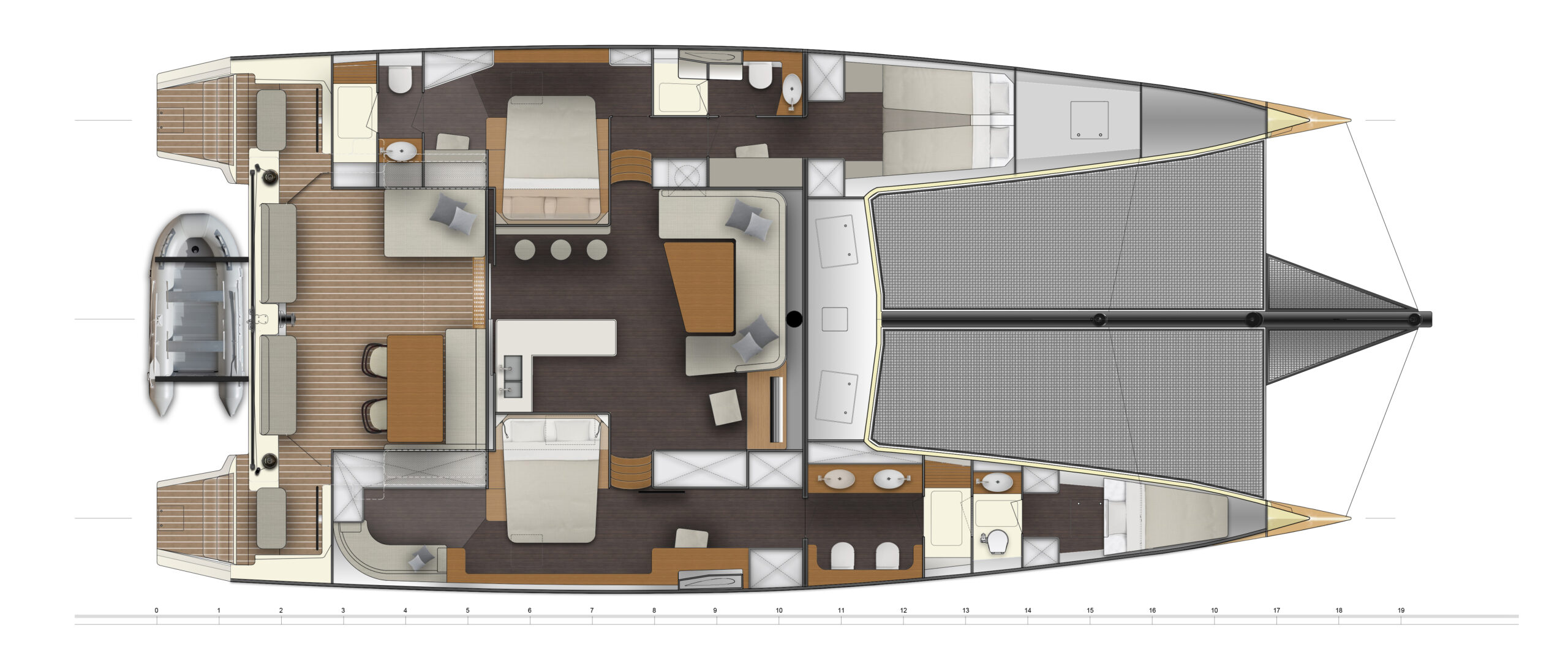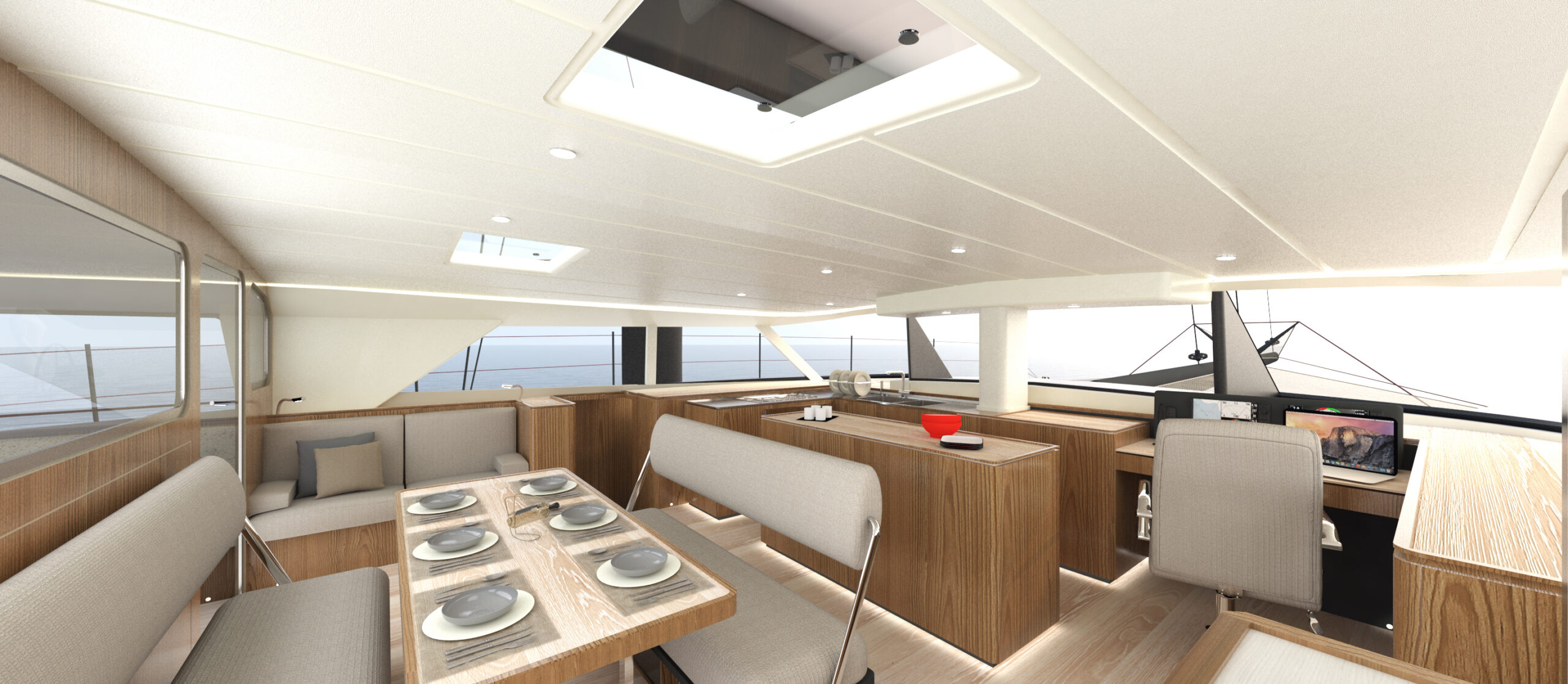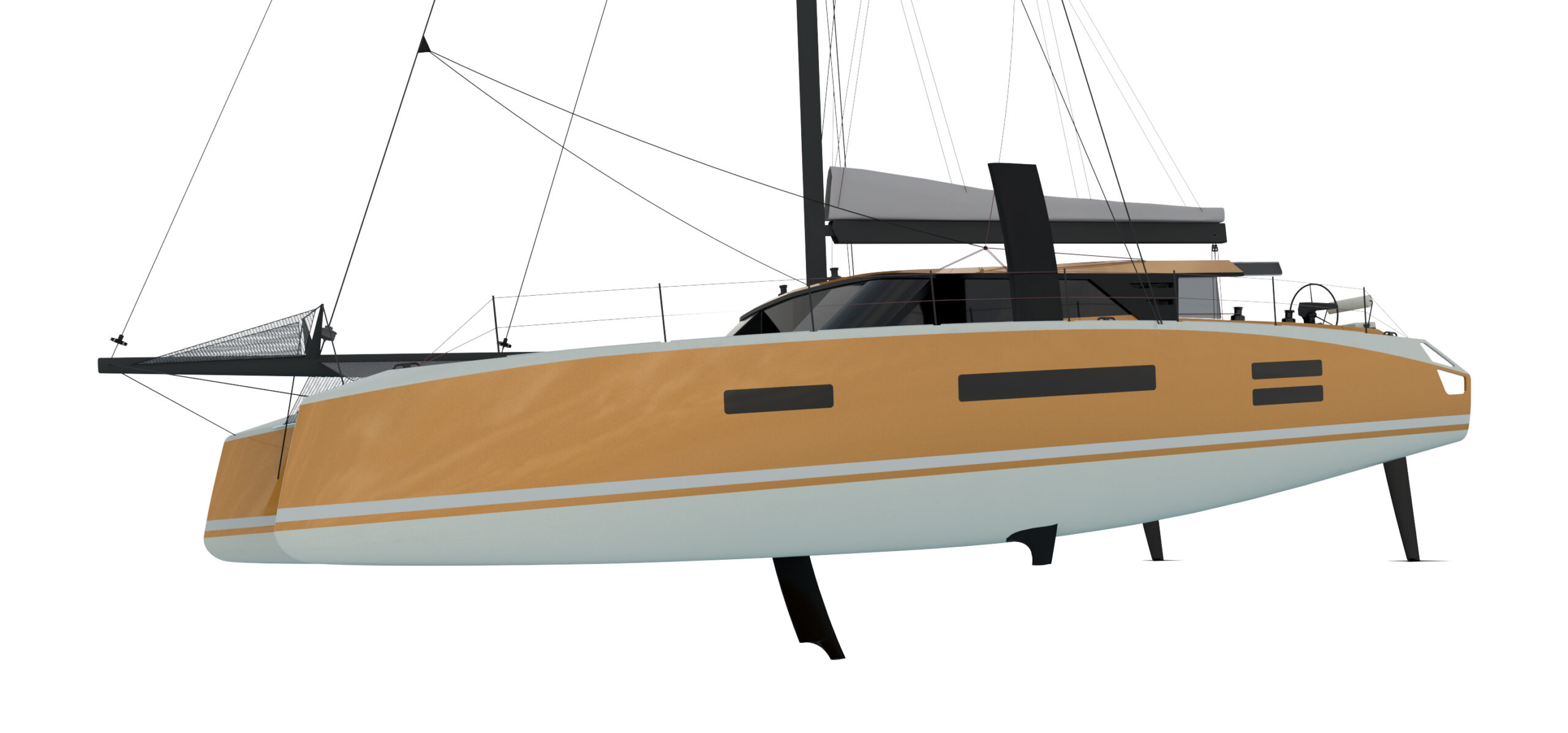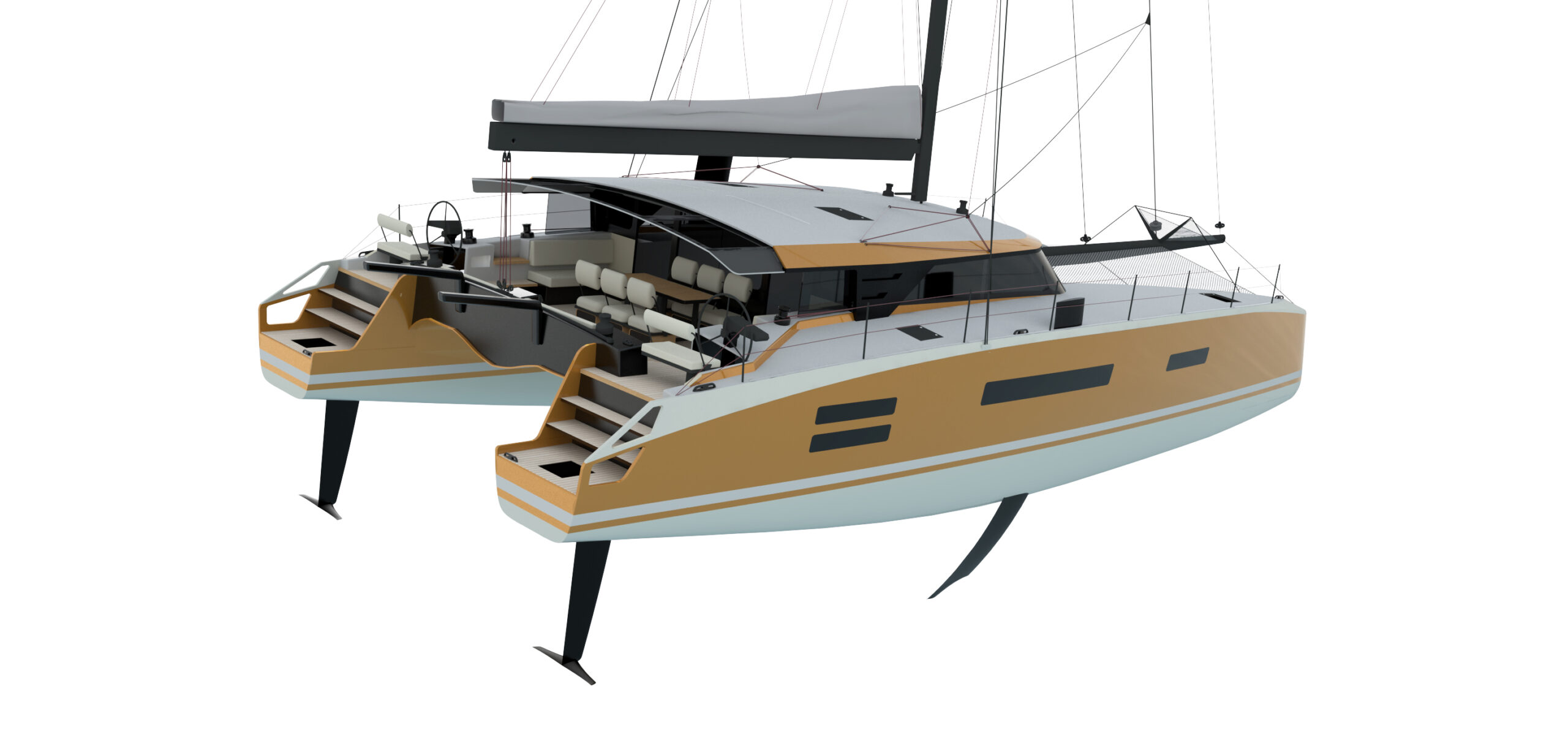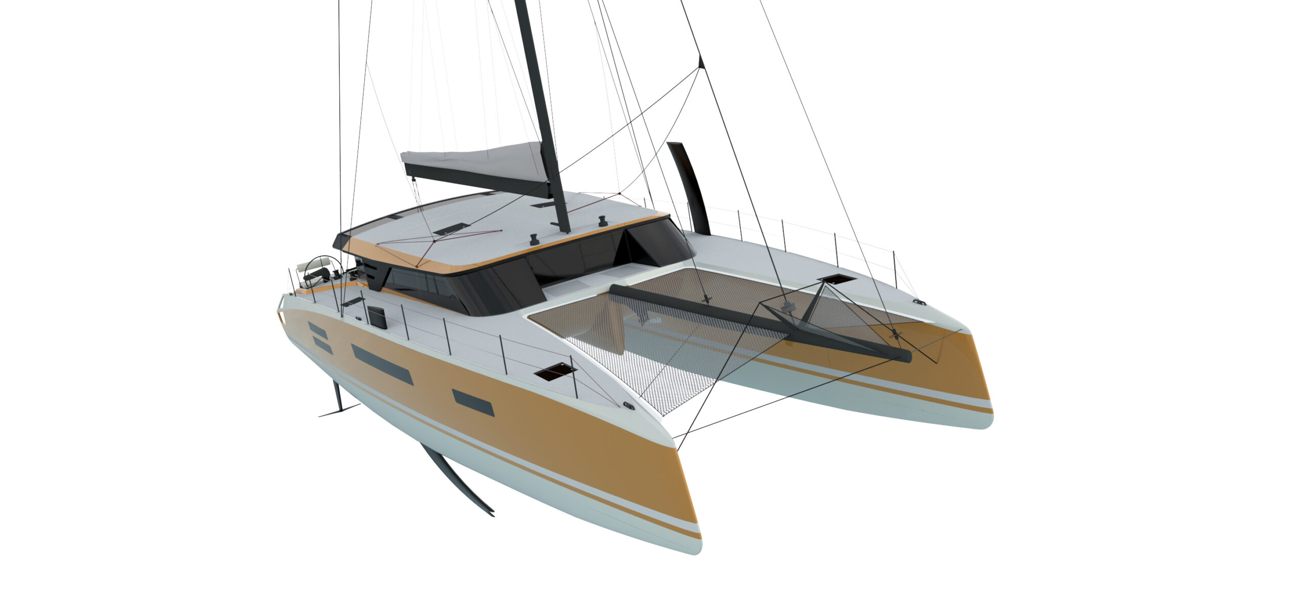 Un catamarano da crociera di lusso ad alte prestazioni molto veloce e navigabile in grado di sopportare il peso extra dell’attrezzatura da crociera e il comfort, come fanno i moderni maxi-yacht. I multiscafi “fanno meglio” perché sono veloci e spaziosi, ma come tutti sappiamo il peso è la controparte, ma anche linee d’acqua, appendici, centri di progettazione, altezza del ponte, piano velico, concentrazione dei pesi sono tutti punti determinanti.