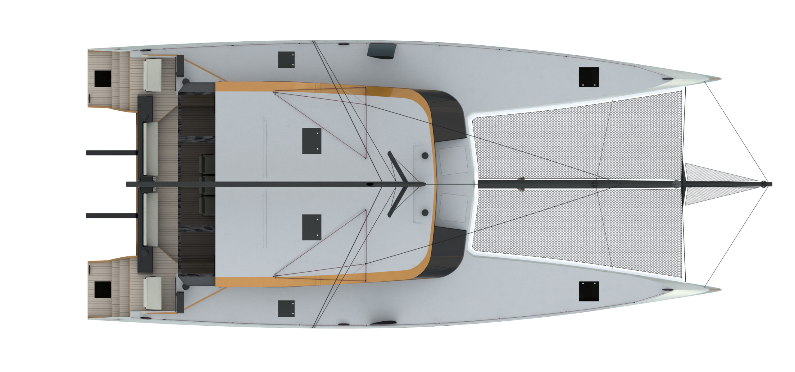 Moana Custom ha chiesto a VMV YD la stessa cura nell’architettura navale in quanto si trattava di un progetto per un catamarano da regata destinato ad uso endurance. SuperCat66′ naviga veloce e scorrevole in crociera e resiste alle onde prolungate e alle sollecitazioni del vento senza temere per la struttura, progettata nel 2020, e costruita per passaggi oceanici sicuri in entrambe le direzioni e vacanze lussuose e confortevoli in climi caldi o freddi, Supercat66′ non scende a compromessi per essere un attore importante nel circuito mondiale dei multiscafi. Linee d’acqua strette e profonde, un ponte molto alto, appendici efficaci, un piano velico ottimizzato per un’ampia gamma di situazioni, manovre pensate anche in equipaggio. I pesi e gli impianti di bordo sono posizionati nel centro longitudinale, come richiesto da fini velisti ed esperti navigatori. I layout del pozzetto, della zona giorno e degli interni dello scafo sono pensati per un comodo utilizzo in crociera. Anche nelle versioni base RACE e PRO-RACE sono presenti cabine e toilette separate. Volumi, aria e luce sono nei parametri medi di questi yacht, con scafi più profondi abbiamo aggiunto grandi spazi di stivaggio e serbatoi più grandi per lunghe traversate o liveaborders.